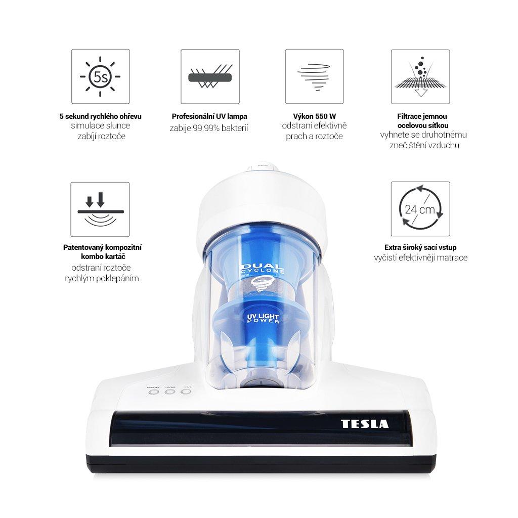 TESLA LifeStar UV550 si při čištění poradí s hluboko usazeným prachem, zvířecí srstí a jinými nečistotami. Výkonná UV-C lampa a horký vzduch zničí 99.9% bakterií, alergenů a roztočů, sterilizuje matrace, polštáře, čalounění a snižuje tak riziko vzniku astmatu a kožních onemocnění. Rotační turbo kartáč pronikne hluboko do vláken textilu a efektivně odstraní nežádoucí mikroorganismy.