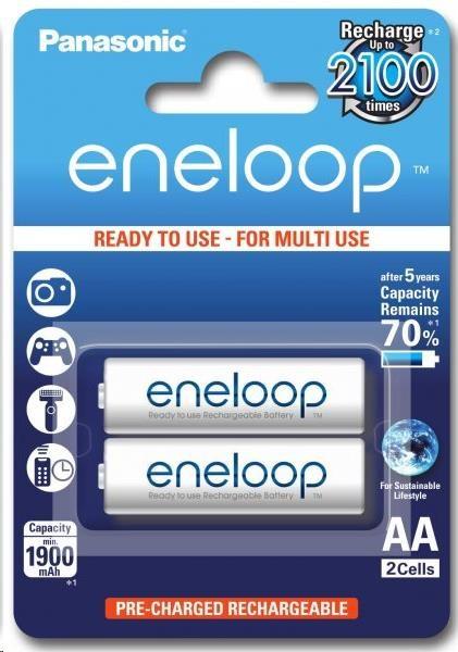 Unikátní tužkové baterie AA (R6) nově s 2100 dobíjecími cykly, které mají maximálně eliminovaný efekt samovybíjení. Díky speciální technologii udrží tyto baterie po dobu pěti let 70% své kapacity. Baterie Eneloop se dodávají v nabitém stavu a jsou připraveny k okamžitému použití.