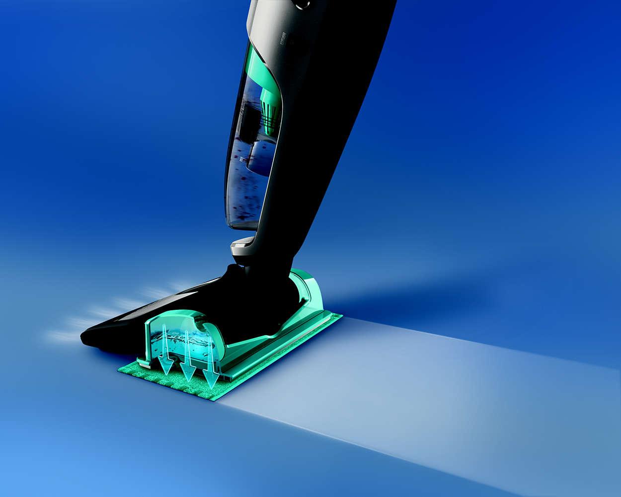 Jedinečný stírací systém reguluje uvolňování vody a udržuje tak optimální vlhkost všech typů tvrdých podlah po celou dobu čištění. Polštářky z mikrovlákna* je možné prát ručně nebo v pračce.