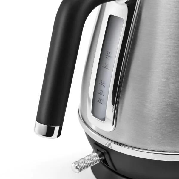 objem 1,7 l, sofistikovaná matná metalická povrchová úprava snerezovými a chromovanými detaily, 360° otočná základna pro snadné použití, ukazatel hladiny vody, 3-stupňová bezpečnostní ochrana