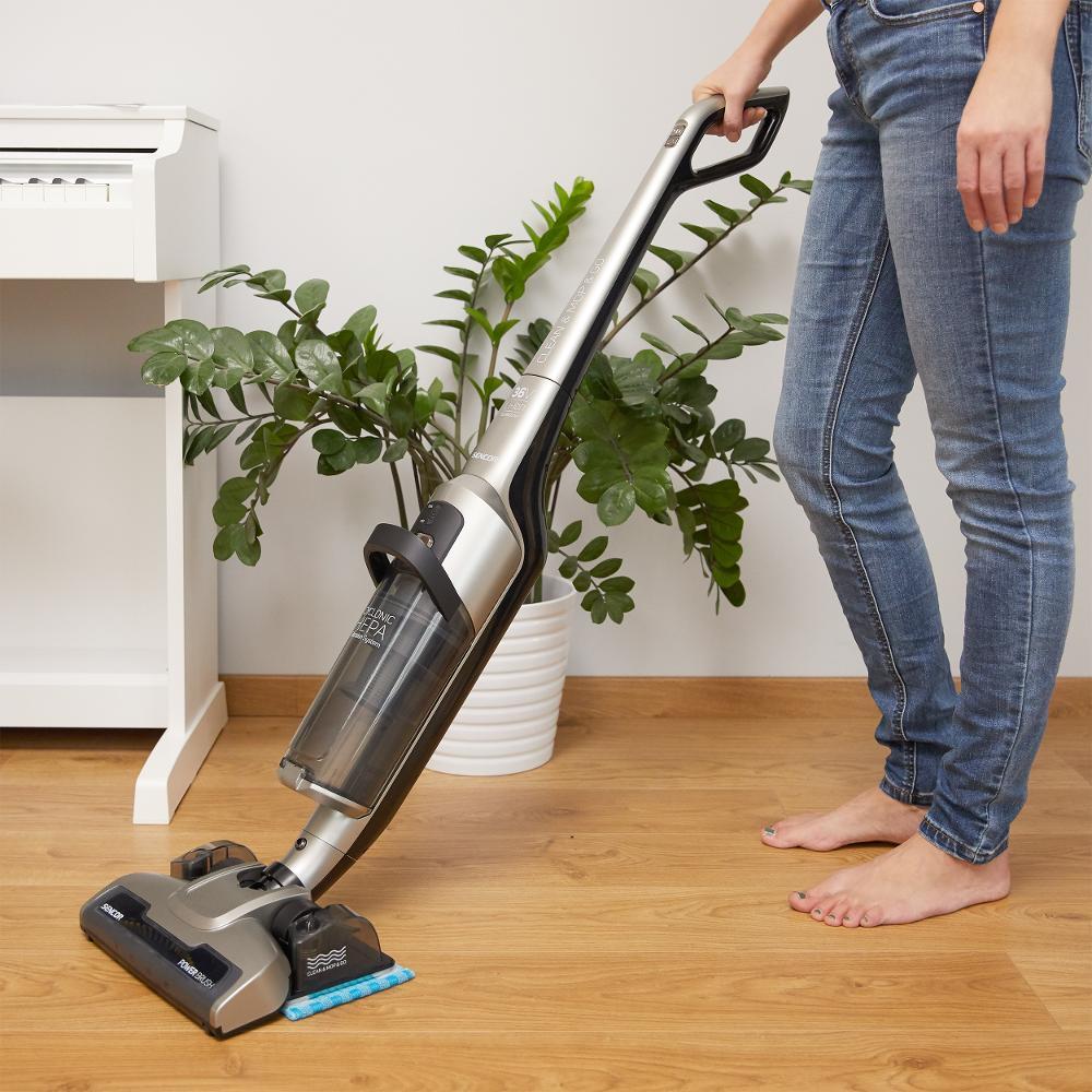 Představuji se jako nový tyčový vysavač od Sencoru a nabízím mnoho užitečných funkcí i vysoký výkon! Pracuji s vysoce kapacitní baterii Li – Ion 36 V, s kterou zajišťuji kompletní volnost pohybu při vysávání, a to po dobu až 60 minut. Užijte si bezšňůrový provoz s akumulátorovým vysavačem SVC 8936TI, který je velmi lehký, tichý a snadno ovladatelný!Vysávám i vytírám zároveň!