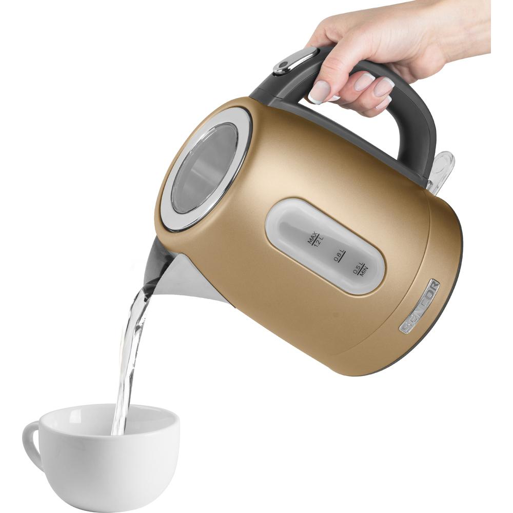 Rychlovarná konvice, Příkon 2150 W, objem 1,2 l, ukazatel hladiny vody, vyjímatelný a omyvatelný filtr pro zachycení nečistot a usazenin, dvojnásobné bezpčnostní jištění.
