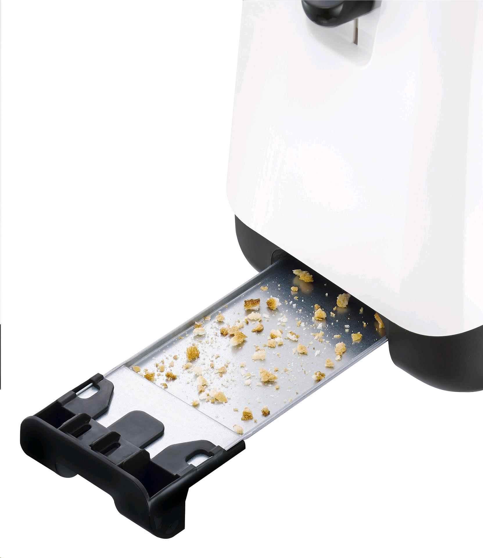 Pkač topinek, Příkon 850 W, 2 štěrbiny. 7 stupňů nastavení toastování, funkce rozmrazování a rozpékání, vyjímatelná přihrádka na drobky.