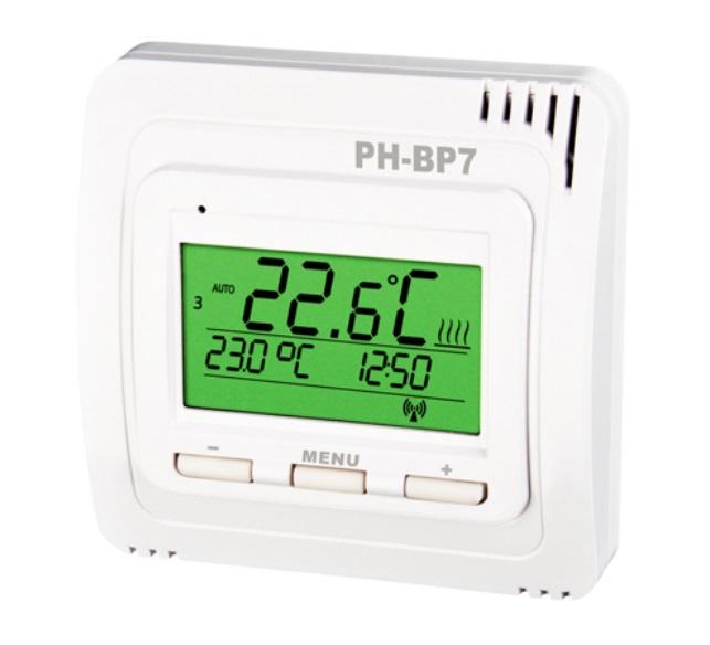 PH-BP7-V je bezdrátový termostat (vysílač), který podle požadované teploty v místnosti ovládá přijímací jednotky PH-BP7-P, PH-BP1-P, PH-BP1-P9, které spínají připojené topné zařízení. V systému PocketHome® vysílač snímá aktuální teplotu v místnosti, z centrální jednotky přijímá informaci o požadované teplotě a podle rozdílu teplot vysílá požadavek do přijímače. V objektech, kde není požadavkem centrální ovládání, může komplet pracovat i autonomně bez centrální jednotky.