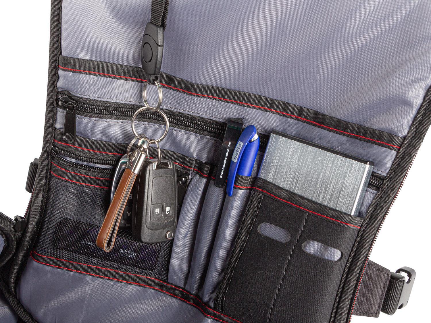 Přední panel připravený pro uložení příslušenství, klíčů, psacích