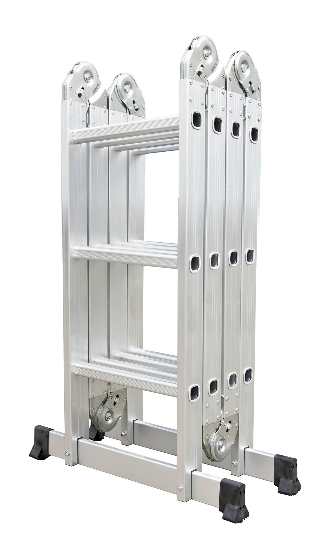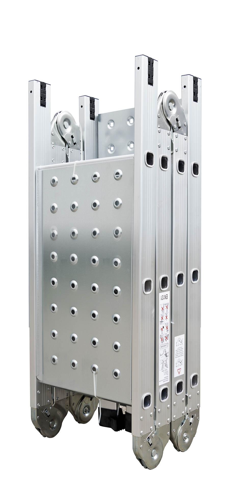 Hliníkové štafle, Délka složených štaflí: 1,8 m, Výška v pozici lešení: 1 m, Maximální délka rozloženého žebříku: 3,7 m, Váha: 15 kg, Nosnost: 150 kg