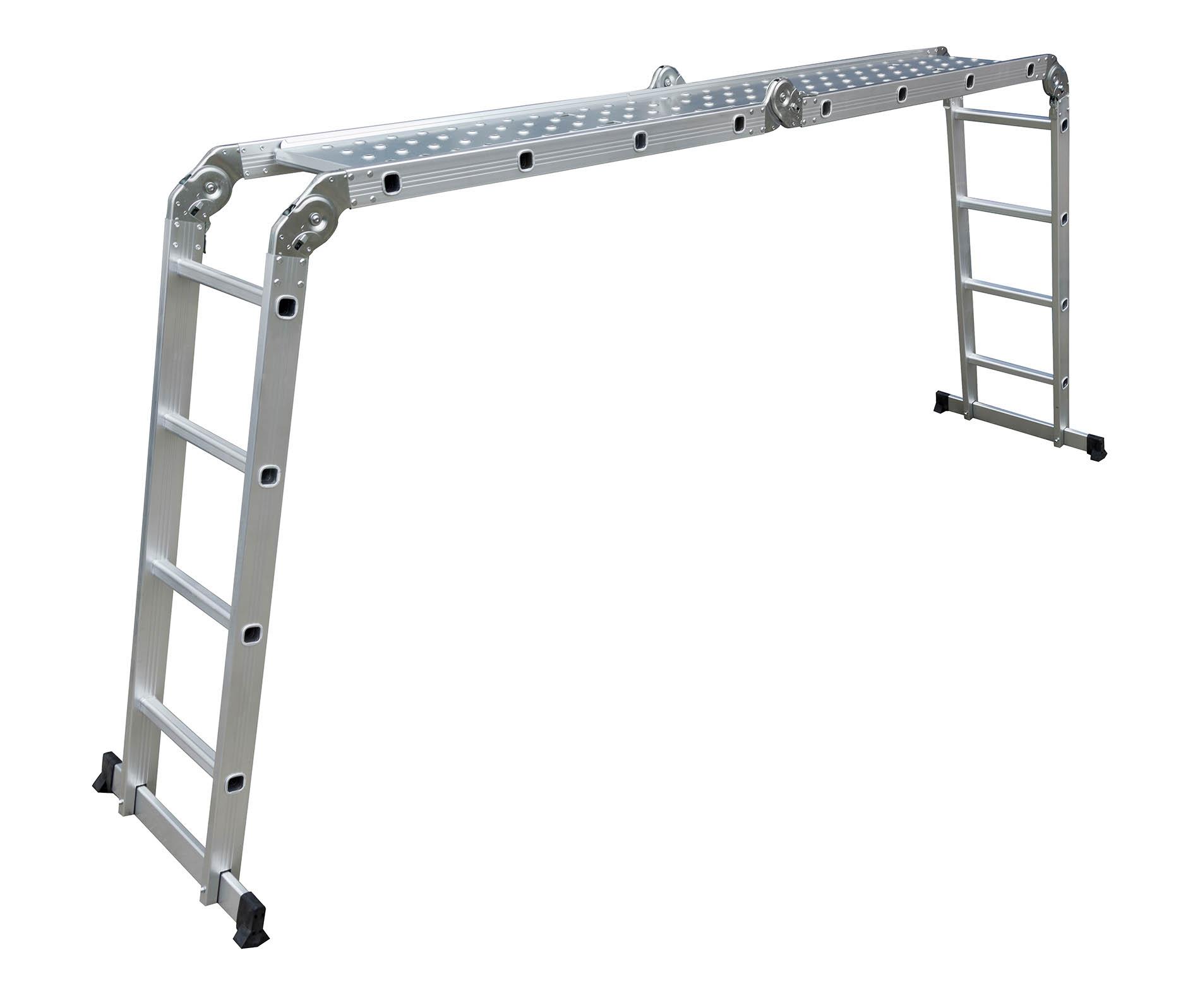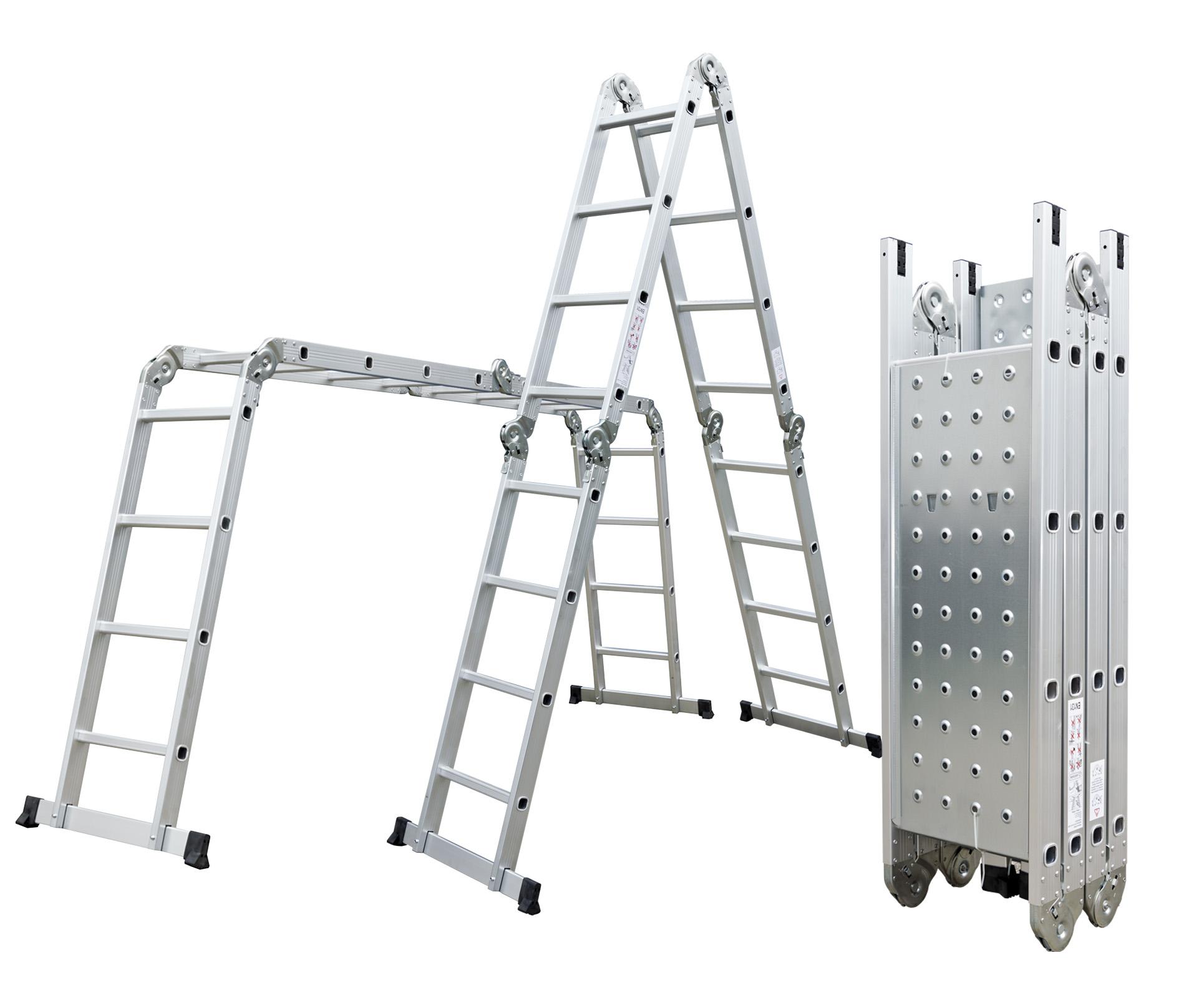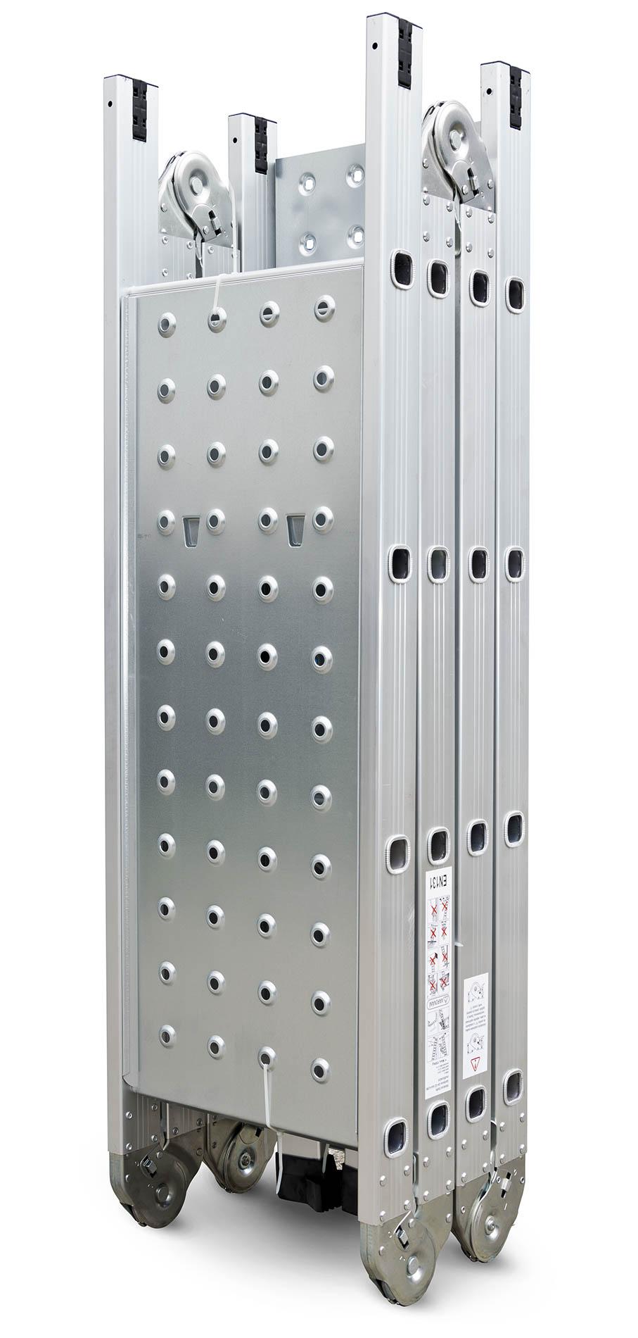 Hliníkové štafle můžete využít jednak jako dlouhý žebřík v délce až 4,6 m. Další variantou je možnost sestavit štafle jako přenosné lešení. Balení obsahuje 2 ks podlážek pro přestavbu štaflí na lešení. Díky konstrukci s klouby lze štafle snadno umístit přes hřeben střechy.