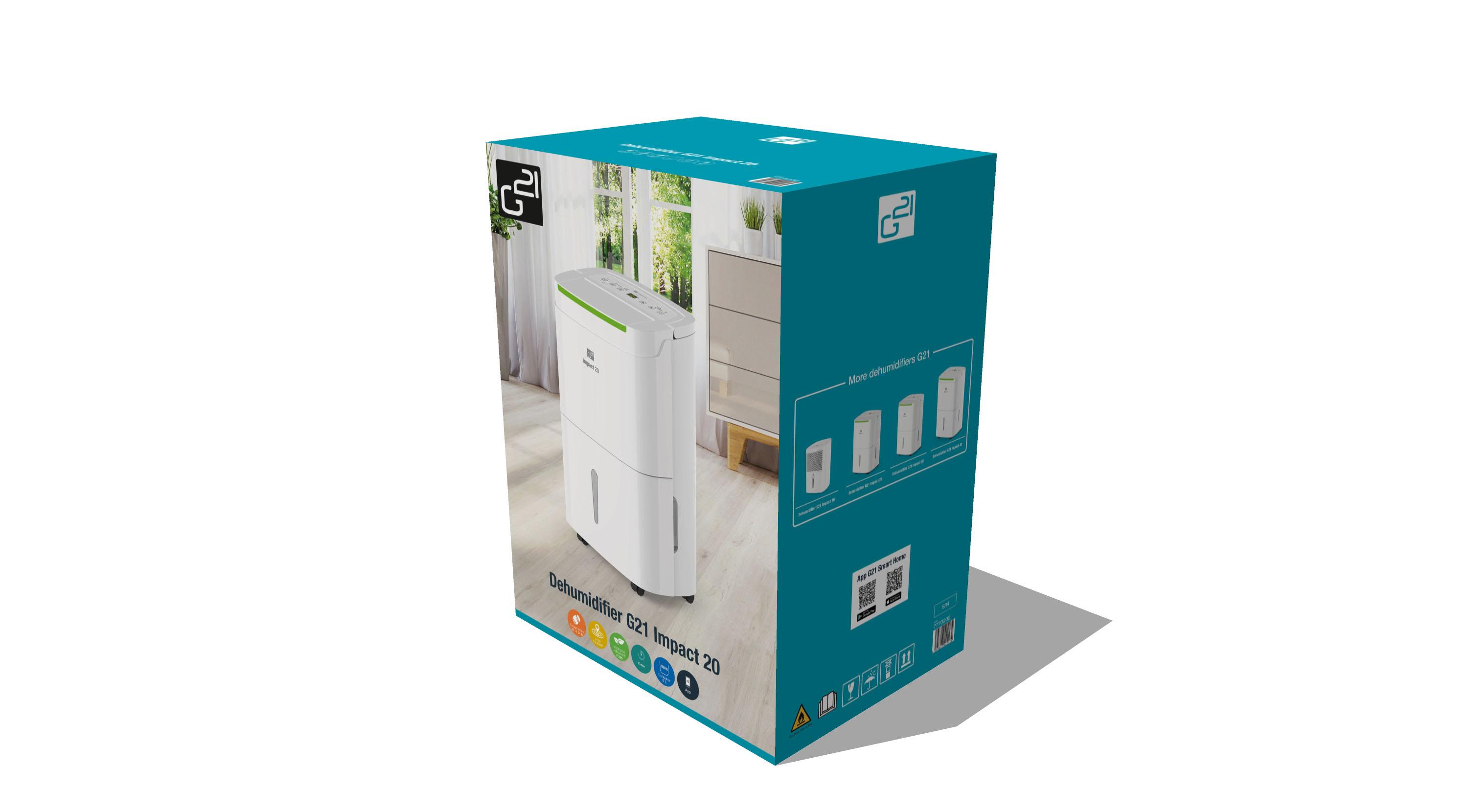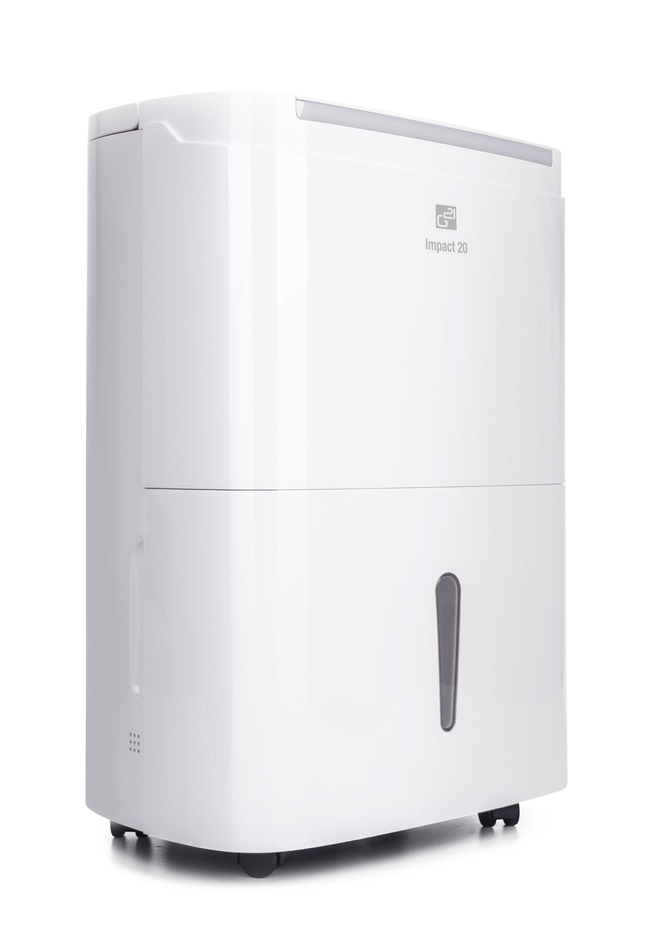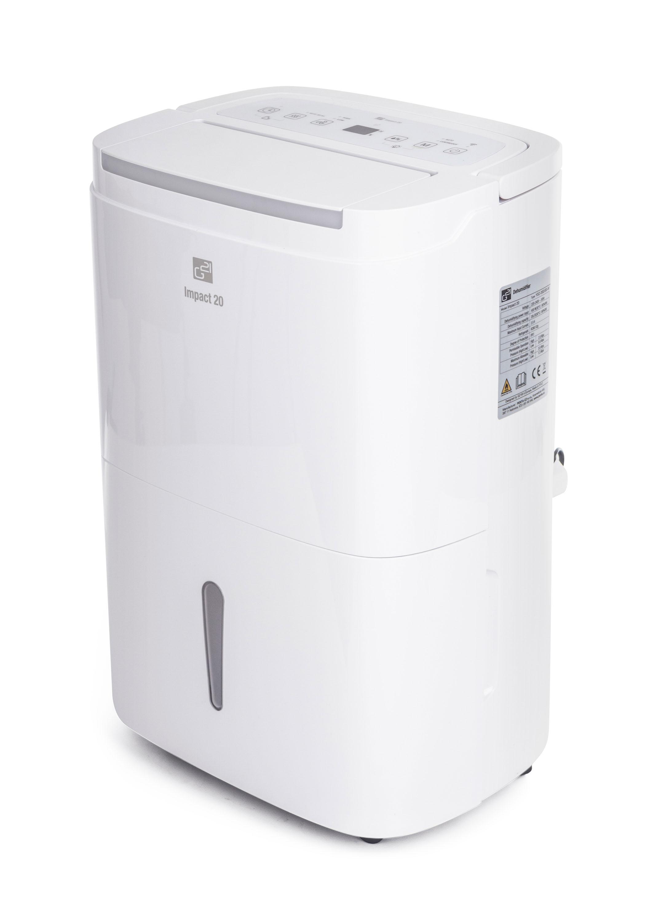 Odvlhčovač vzduchu G21 Impact 20 od české značky G21 má kapacitu 20 l za 24 hodin. Je vybaven 5l, dostatečně velkou nádržkou na kondenzát s průhledným indikátorem stavu. Pozorovat jej však ani nemusíte – odvlhčovač se při naplnění nádržky sám vypne. Odvlhčovač používá ekologické chladivo R290, které nepoškozuje ozónovou vrstvu.