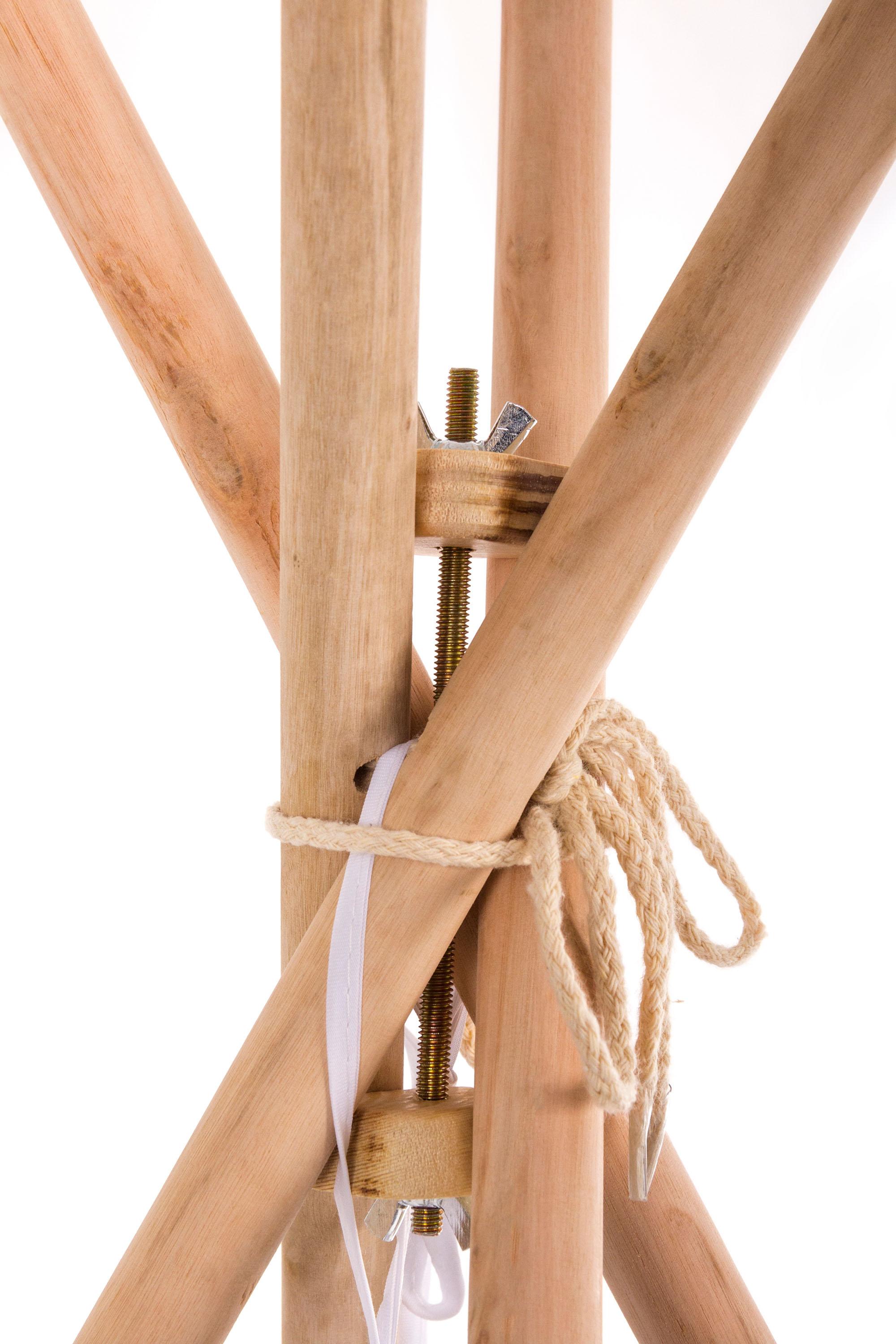 Velice snadno. Jelikož je celý plášť stanu doručován v kuse a je dokonale připraven pro montáž, stačí jen provléknout 4 dřevěné tyče příslušnými tunýlky, nahoře tyče svázat, upevnit fixační sadou G21 (je součástí balení) a teepee je na světě! Podlážku položte na podlahu teepee. Vchod do stanu můžete buď zabezpečit pomocí připevněných provázků pro trvalé otevření, nebo jej spustit dolů a dopřát dětem soukromí.