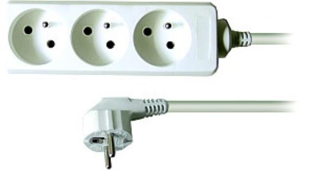 Klasický prodlužovací kabel se 3 zásuvkami na 230V. Délka kabelu je 3