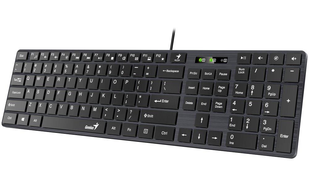Elegantní drátová klávesnice v černém provedení disponuje tenkým profilem a komfortním jemným sklonem. Díky tomu poskytuje uživateli maximální pohodlí při každodenní práci. Předností jsou také multimediální klávesy pro ztlumení zvuku, otevření E-mailu apod. Díky podpoře aplikace Smart Genius je možné si funkci některých kláves přizpůsobit. Připojení k počítači je realizováno skrze USB port.