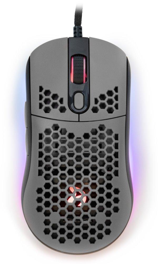 Ultralehká herní myš disponující 7 programovatelnými tlačítky a vysoce přesným optickým senzorem Pixart 3389 s rozlišením až 16000 dpi. Kryt v designu plástve snižuje celkovou hmotnost, zlepšuje odvod tepla, a tím zajistí i pevnější uchopení myši. Herní design poté doplňuje nastavitelné RGB podsvícení. Kvalitní spínače Omron vydrží více než 20 milionů kliknutí. Připojení je realizováno skrze opletený USB kabel.
