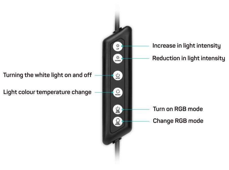 - změnu intenzity světla v 9 úrovních - nastavení barevné teploty světla - celkové zapnutí a vypnutí světla - zapnutí a vypnutí RGB módu - změnu RGB světelných efektů |
