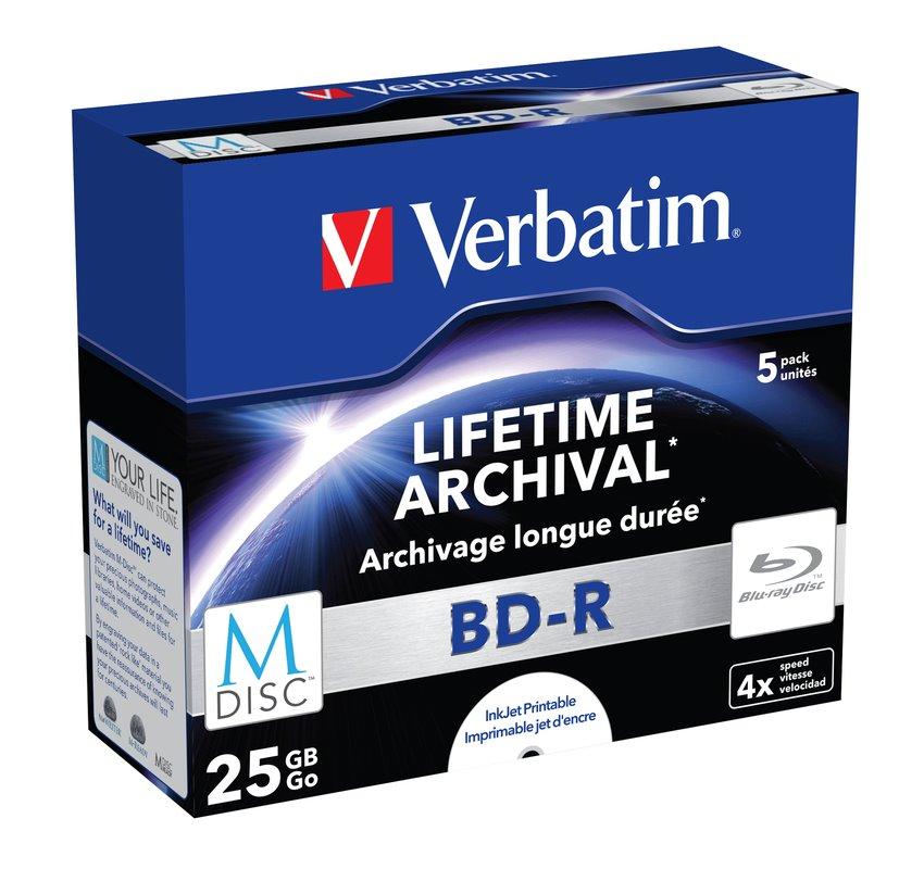 Verbatim M-DISC je novým standardem v digitálním ukládání. Je navržen tak, aby zachoval a ochránil vaše soubory vyrytím informací do patentované vrstvy, která je odolná vůči světlu, teplotě i vlhkosti. Balení pěti Blu-Ray médií. Nabízí maximální zapisovací rychlost až 4x. Kapacita média je 25 GB. Disky je možné potisknout na inkoustových tiskárnách. Předpokládaná doba životnosti disku je až 1332 let.