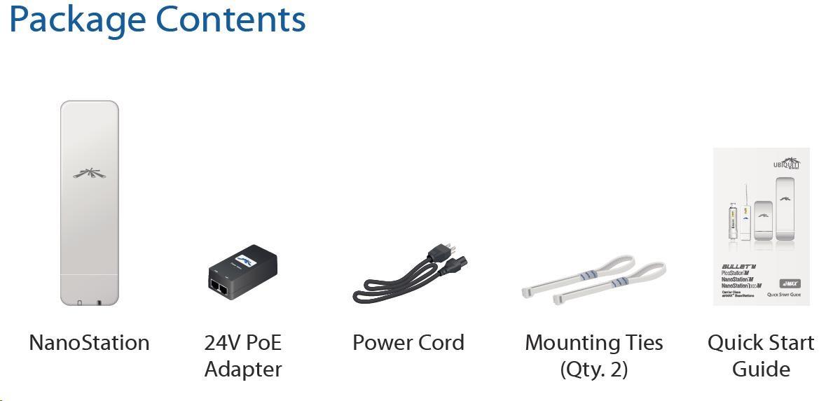 NanoStation M2 je výkonná kompletní venkovní jednotka včetně 2 x 11 dBi antény (MIMO) pro pásmo 2,4 GHz. Jednotka umožňuje komunikaci reálnou rychlostí až 150 Mbps. Další výhodou je vedle vysoké přenosové rychlosti díky standardu 802.11n využití časového multiplexu TDMA, což umožňuje na jednotku v režimu AP připojit více než 300 klientů a nízké latence. Oproti předchůdci NanoStation2 má silnější procesor taktovaný na 400 MHz a větší paměť. Součástí balení je i 15 V napájecí zdroj a PoE injector, který obsahuje resetovací tlačítko pomocí kterého lze také NS uvést TFTP módu pro obnovu firmwaru.